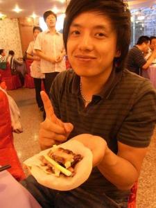 (写真は、5月の中国ツアーで北京ダッグの食べ方を伝授する陳松さん。)