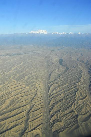 写真は飛行機からの眺め。向こうに「天山山脈」が連なっているのが見えます。