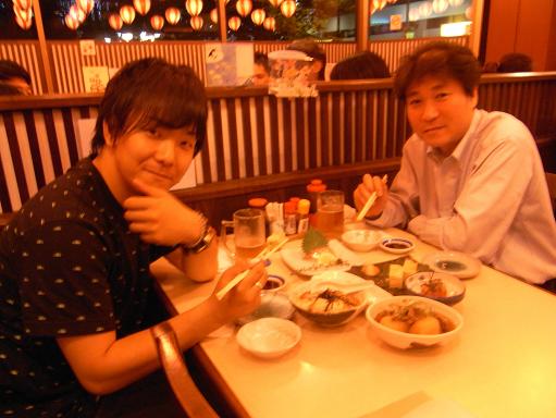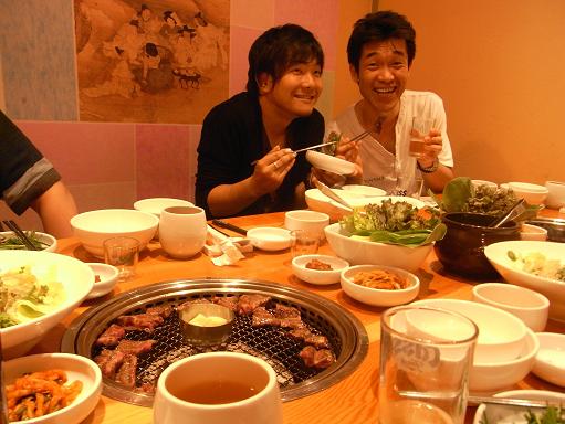 夜。韓国の焼肉をご馳走になって上機嫌の田中彬博。