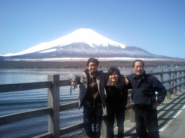 写真は朝の富士山です。寿さん、キシモトソウタさんと記念撮影。