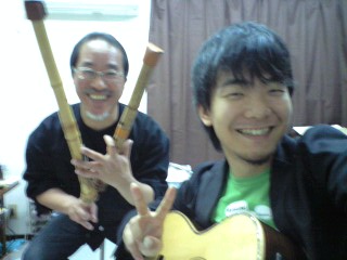 写真は、ライブ前の控え室にて。寿さん、「尺八ピース」です(笑)。