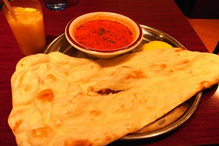 写真は、お昼にインドカレー屋さんで食べたカレー。ナンでかっ!